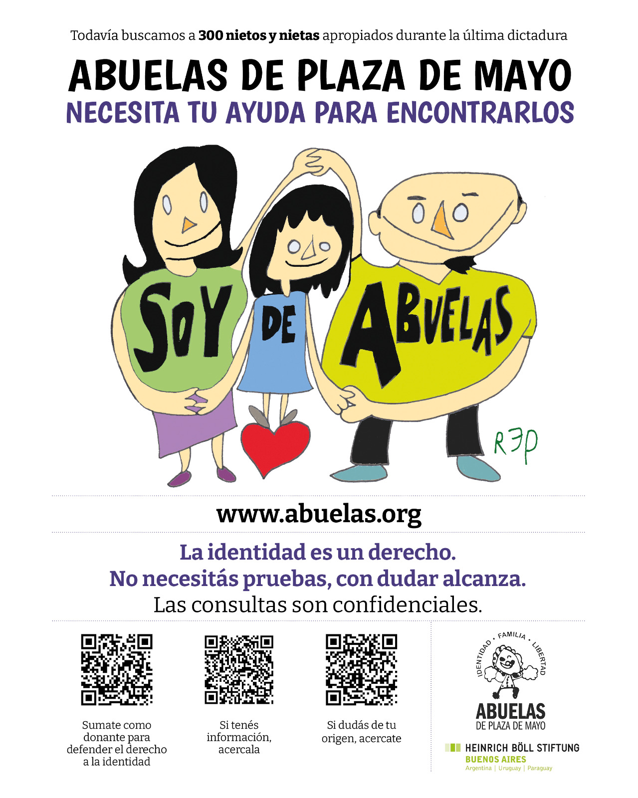 En el marco del 48° aniversario de Abuelas de Plaza de Mayo y en el Día Nacional del Derecho a la Identidad, convocamos a la sociedad, instituciones, organizaciones de la sociedad civil y la comunidad educativa a sumarse a la campaña “Soy de Abuelas”, con el objetivo de visibilizar la búsqueda de los nietos y nietas que seguimos buscando. Sólo sosteniendo la pregunta por la identidad podremos encontrar a los desaparecidos vivos de la última dictadura.