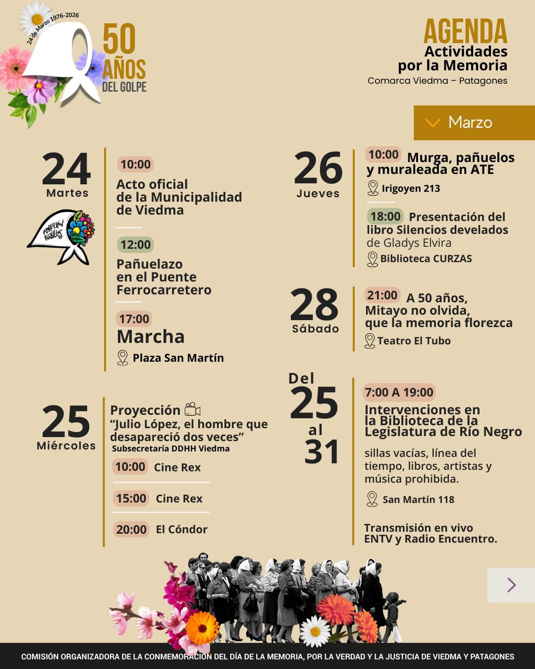 La Red Comarca Viedma-Patagones anticipa actividades hasta el 31 de marzo inclusive, con pintadas, murales, poesía, cine y marcha. La Red de Esquel-Trevelin realiza una estampada de pañuelos. La Red Comarca Andina Paralelo 42 anuncia actividades en El Maitén y en El Hoyo, con el apoyo municipal. La Red de San Martín de los Andes organiza un festival por la Memoria, la Verdad y la Justicia, con música, teatro, danza, y así en todas partes.