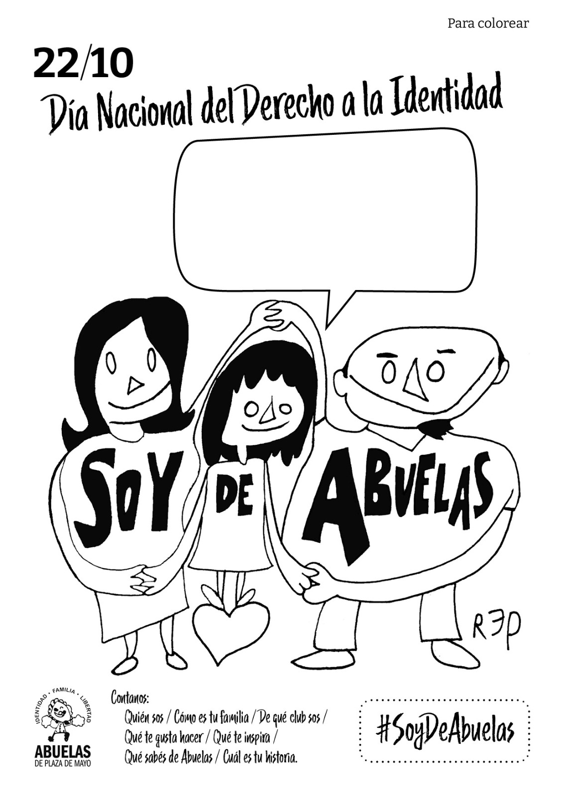 En el mes de la Identidad, la propuesta es sencilla: Contanos: Quién sos / Cómo es tu familia / De qué club sos / Qué te gusta hacer / Que te inspira / Qué sabés de Abuelas / Cuál es tu historia. Podés hacerlo con la propuesta de la campaña, grabar un video, dibujarlo, hacer una canción o lo que más te guste. Lo importante es que todos y todas sigamos hablando de nuestra identidad. En este link encontrarán materiales para trabajar y también para difundir la campaña.