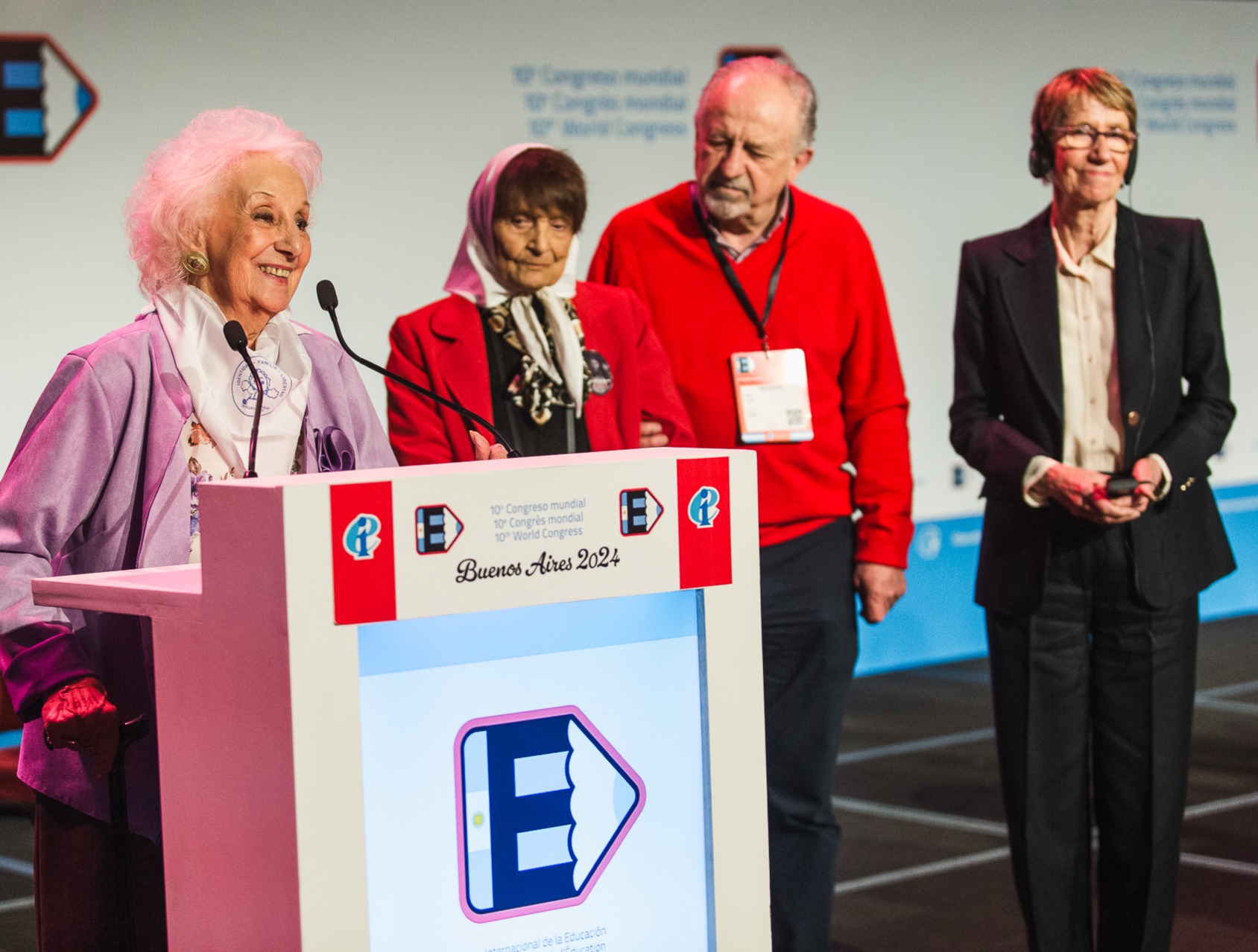 La presidenta de Abuelas de Plaza de Mayo, Estela de Carlotto, fue distinguida junto a Taty Almeida de Madres de Plaza de Mayo, Línea Fundadora en el Congreso Mundial de la Internacional de Educación (IE), en el marco de un emotivo homenaje a Abuela y Madres de Plaza de Mayo por su lucha por Memoria, Verdad y Justicia.