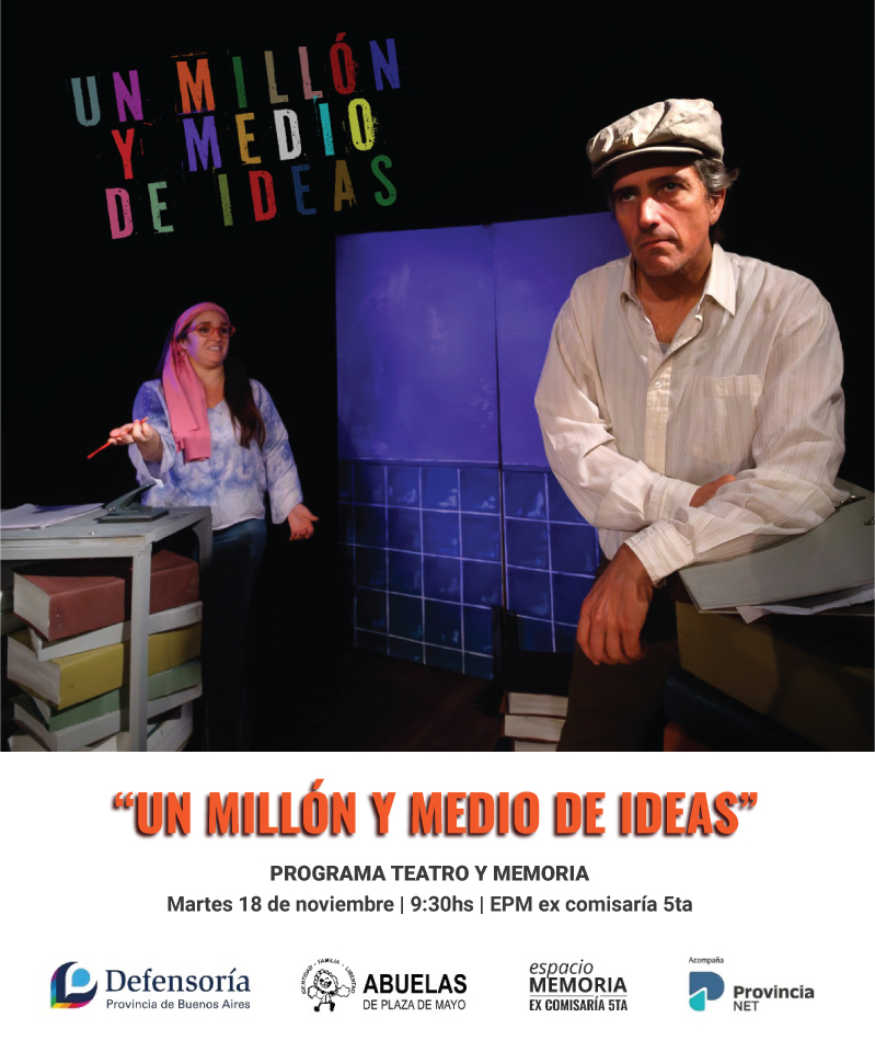 Termina el programa “Teatro y memoria”, el ciclo dedicado a escuelas primarias y secundarias, en el auditorio del Espacio para la Memoria ex Comisaría 5ta. el martes 18 de noviembre a las 9.30 hs. con la última función de “Un millón y medio de ideas” de Diego Mendoza Peña y Eleonora Gottlieb.