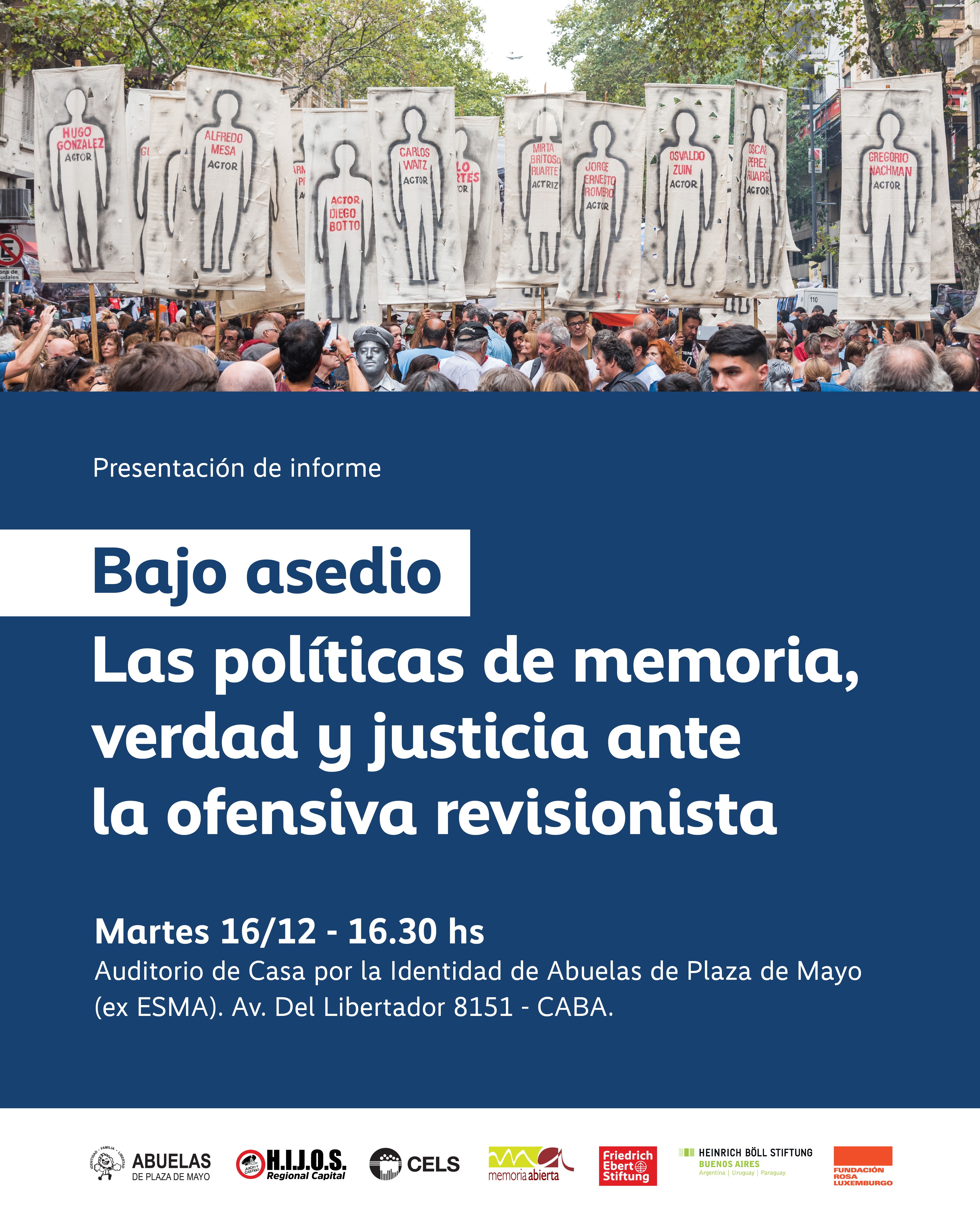 Abuelas de Plaza de Mayo, CELS, H.I.J.O.S Capital y Memoria Abierta, con el acompañamiento de las fundaciones FES Argentina, Heinrich Böll y Rosa Luxemburgo, invitan a la presentación del informe “Bajo asedio. Las políticas de Memoria, Verdad y Justicia ante la ofensiva revisionista”, el martes 16 de diciembre, a las 16. 30 horas, en la Casa por la Identidad del Espacio Memoria y Derechos Humanos, ex Esma (Libertador 8151, CABA). La actividad es libre y gratuita.